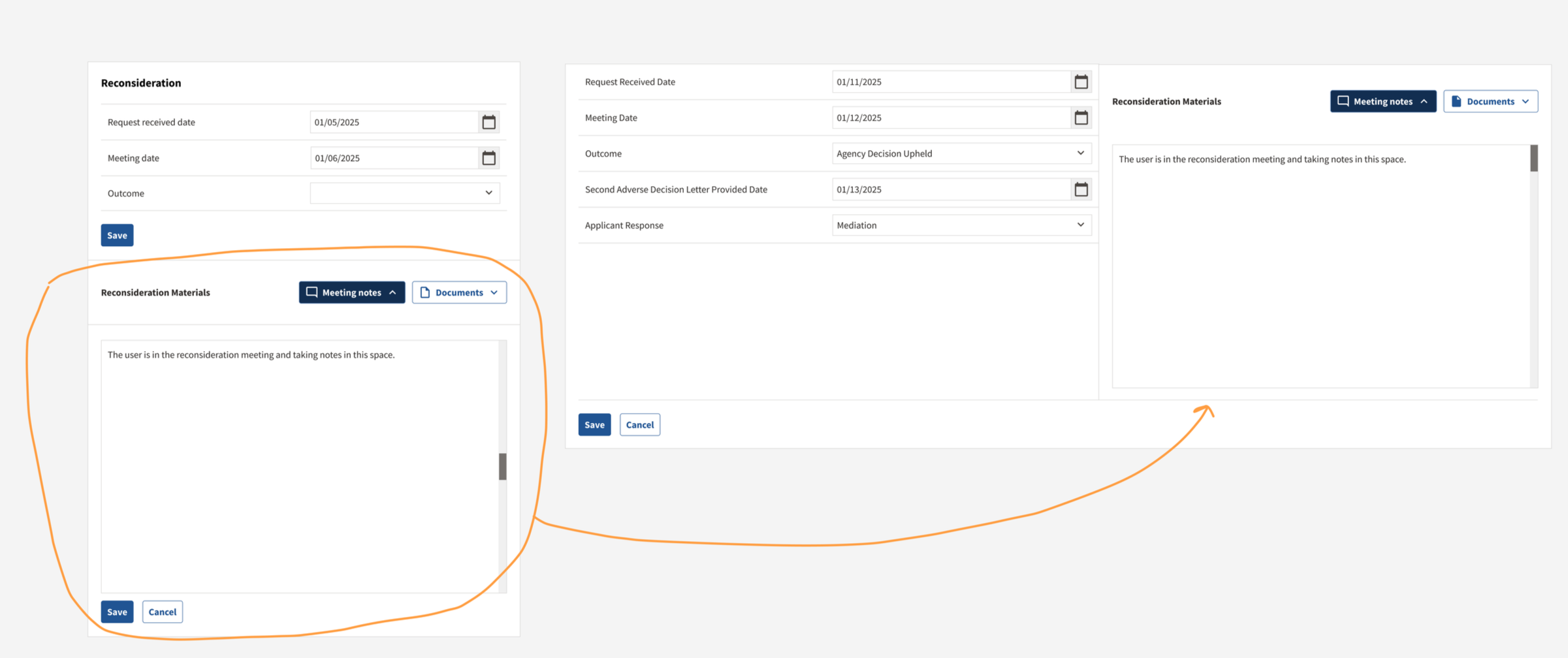 In order to better visualize the path of escalation, each step only becomes expandable once the user reached that stage of the appeals process. The progression is triggered by the “Applicant Response” field in the previous step. This field documents whether the applicant has chosen to escalate the decision and pursue another appeal after the initial meeting. When an applicant decides to move forward, the next step becomes available.