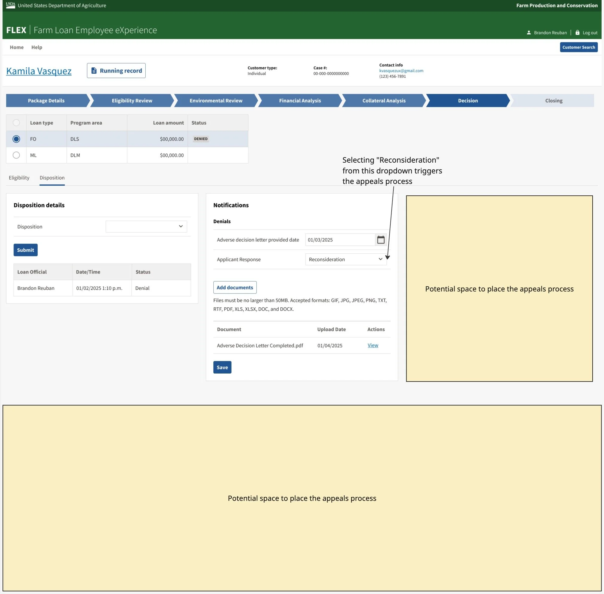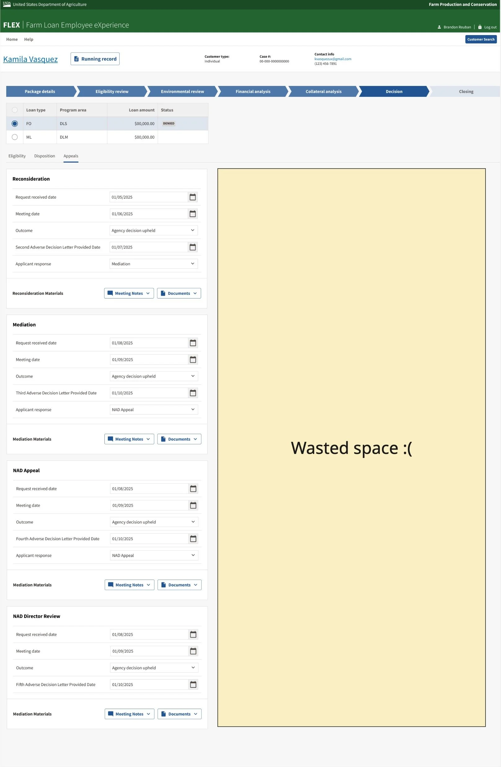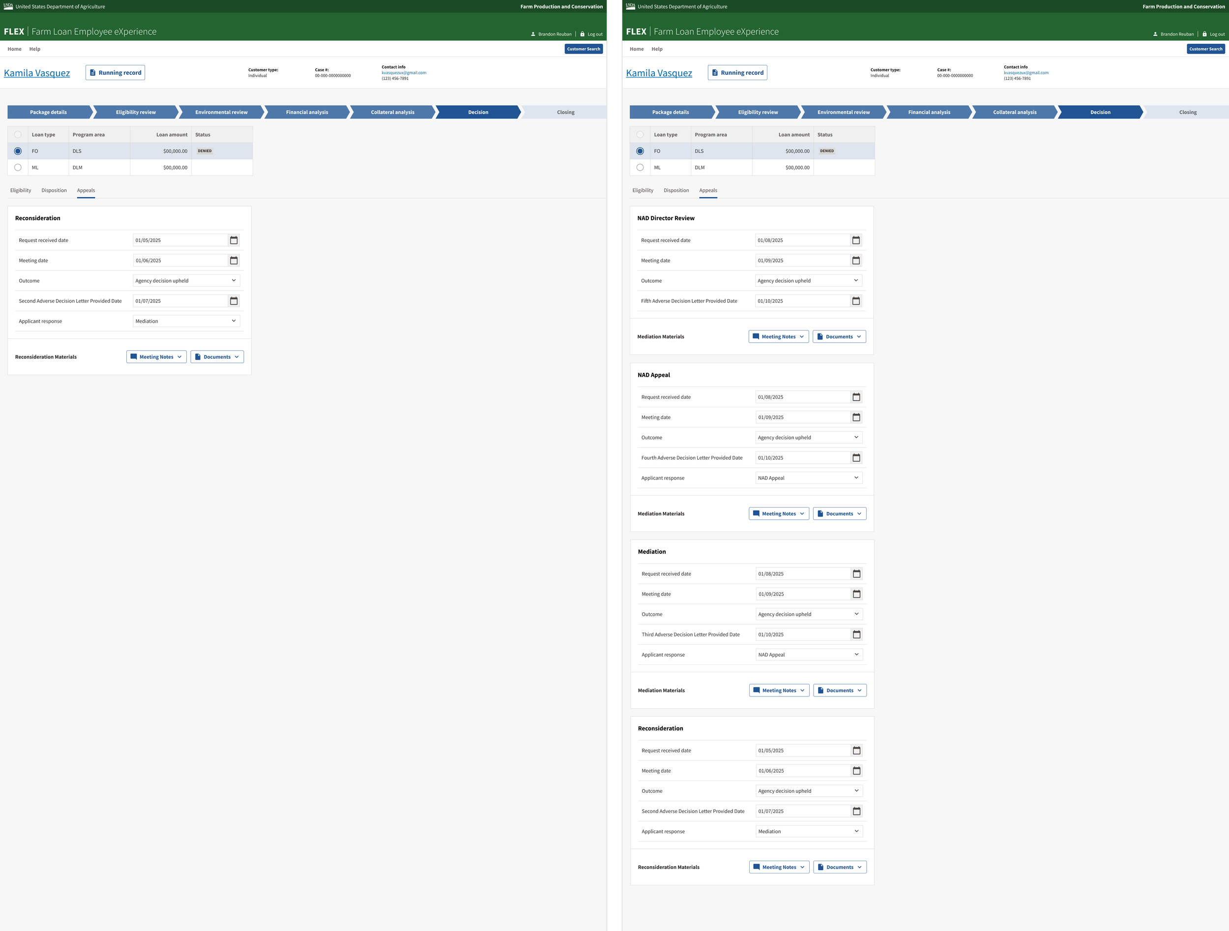 The complexity of the appeals process ultimately became a useful example that the team could point to when advocating for better visibility into upcoming requirements. Along with the rest of the design team, I used this scenario to help product owners understand why having a more complete picture of the workflow upfront was important, especially since we were not permitted to conduct formal research with USDA loan officers.