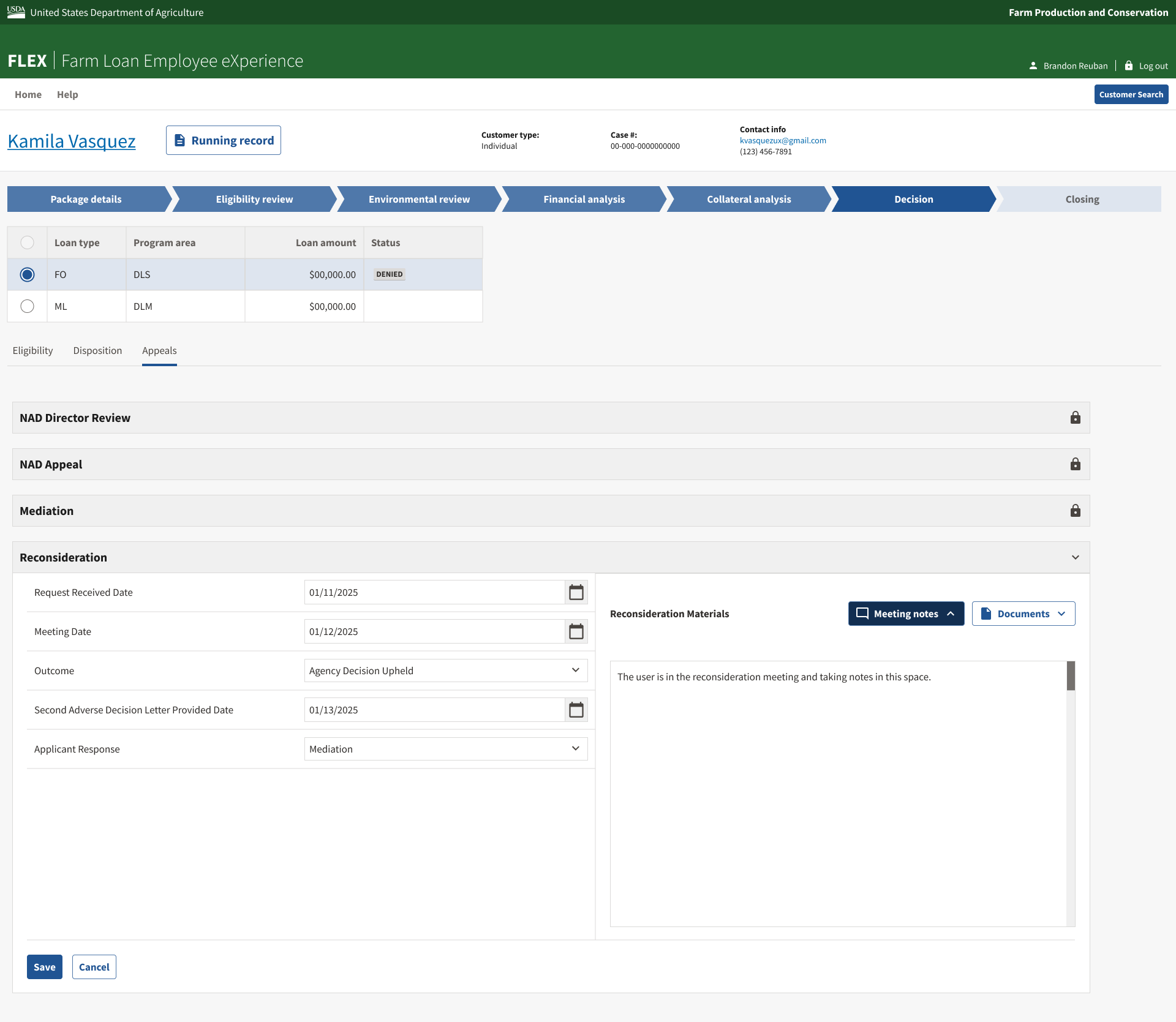FLEX (Farm Loan Employee eXperience) is an internal case management application I helped design for USDA loan officers. Its purpose is to guide loan officers through the end-to-end process of reviewing and deciding on farm loan applications. The product had two goals: make the loan review process more efficient for loan officers, and make it more equitable for applicants by creating a consistent, well-documented experience at every step. The origin of this government contract and creation of this product is based on external research completed by GSA. While the scope of this specific contract did not allow for us to conduct research ourselves, we leveraged these insights as much as possible to inform our designs.